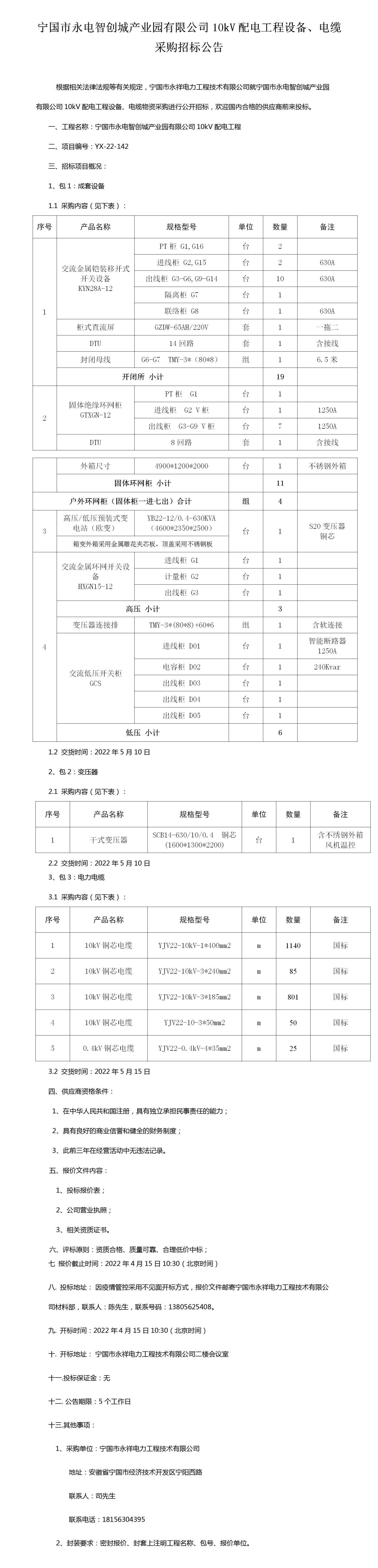 寧國市永電智創(chuàng)城產(chǎn)業(yè)園有限公司10kV配電工程設(shè)備、電纜 采購招標(biāo)公告
